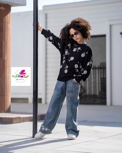 ست بلوزشلوار دخترانه چاپ برجسته بابونه روی شلوار و بلوز شلوار جین ست شده